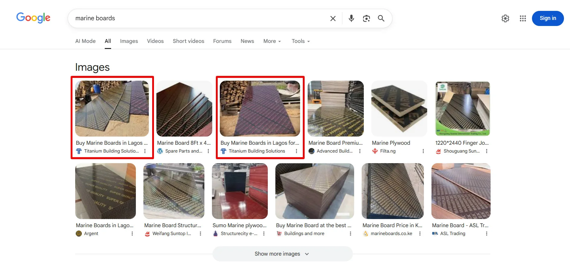 Titanium Building Solutions (TBS) is a Lagos-based supplier of building materials with both an online store and a physical outlet in Lekki. They provide essential construction products such as marine boards, plywood, cement, iron rods, and other supplies. Despite their wide range of products, the company’s online visibility was limited, and they were not showing up for critical searches like “marine board in Lagos” or “buy building materials online.”